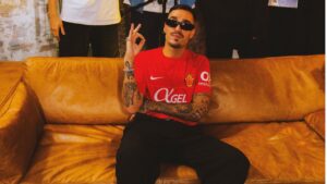 El rapero mallorquín luce camiseta del RCD Mallorca en un posado junto a los presentadores del podcast Club 113, que emite este martes la entrevista con el artista. 358
