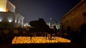 El músico David Gómez protagonizará este miércoles en las calles de Palma un concierto itinerante con el espectáculo ‘Le voyage du piano’, con el que se desplaza en una plataforma móvil con su instrumento iluminado con 200 velas. 443