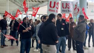 Unas 50 personas se han concentrado este sábado, en el aeropuerto de Palma, convocados por el sindicato USO, junto a CCOO y UGT, para exigir a Iberia la creación de su propio autohandling. 117