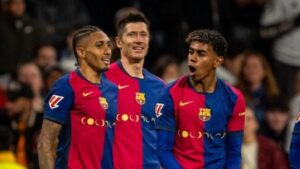 El Fútbol Club Barcelona se ha impuesto con solvencia al Real Madrid (0-4) en el ‘clásico’ del fútbol español celebrado este sábado por la noche en el Santiago Bernabéu. Con este triunfo, los de Flick ya sacan seis puntos a los de Ancelotti en la cima de la tabla. 41