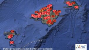 En el último día de junio, las temperaturas registradas en Baleares por la Agencia Estatal de Meteorología (Aemet) sobrepasan los 30 grados en gran parte de las localidades de las islas, llegando en algunos puntos, como el sur de Mallorca y oeste de Menorca, a rozar los 35 grados. 193