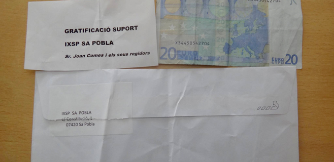 La formación Independents per Sa Pobla ha denunciado este jueves el envío a diferentes domicilios de la localidad, de sobres con dinero y que supuestamente están enviados por parte del concejal Joan Comes y su equipo. IxSP ha anunciado que llevará a cabo las medidas legales que considere oportunas contra todas las personas, organizaciones o entidades que estén tras este envío y interpondrá las correspondientes denuncias ante las instancias judiciales competentes. De momento ha puesto en marcha a sus servicios jurídicos para que estudien las fórmulas de denuncia y se han puesto en marcha para tratar de localizar al o los autores de estos envíos. Finalmente, han explicado que IxSP ni ha entrado ni entrará nunca en un juego tan sucio como éste.
