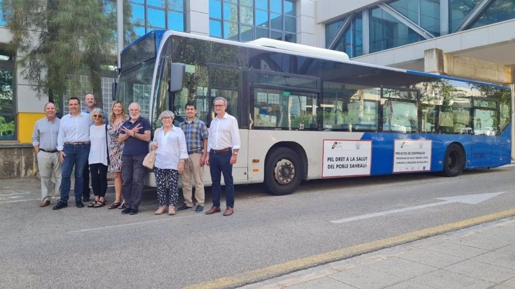 El teniente de alcalde de Movilidad Sostenible, Francesc Dalmau, junto con el gerente de la EMT, Mateu Marcús, la consellera de Salud y Consumo del Govern, Patricia López, el gerente del Hospital de Son Espases, Pep Pomar y el director General del IB-Salut, Juli Fuster, entregaron este viernes a la presidenta de la Asociación de Amigos del Pueblo Saharaui de Baleares (Aapsib), Catalina Rosselló, el material sanitario que viajará dentro de los vehículos.