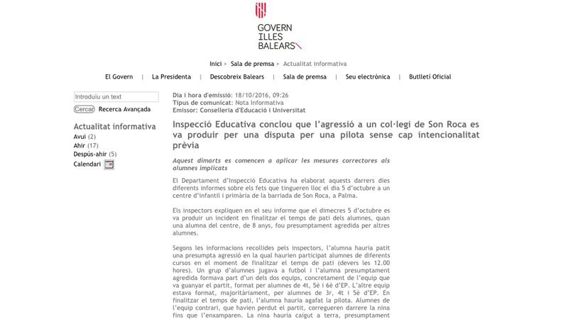 La sanción: expulsión entre 5 y 3 días. La conselleria ha hecho públicas las conclusiones del informe elaborado por inspectores educativos sobre el episodio registrado en 5 de octubre en el colegio del barrio de Son Roca, en el que se establece que la disputa en el patio del centro se produjo "sin ninguna intencionalidad previa".