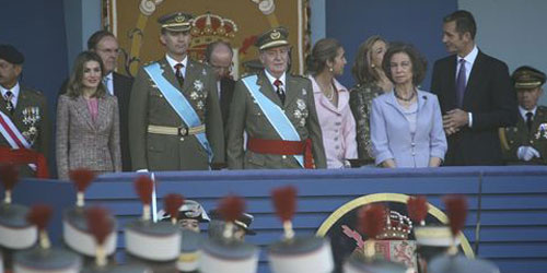 Los Reyes presiden la parada militar que se celebra en Madrid con motivo de la Fiesta Nacional, un acto en el que se han escuchado algunos gritos contra el presidente del Gobierno, José Luis Rodríguez Zapatero, pero más leves que en años anteriores. El Rey y el resto de la Familia Real fueron recibidos a pie de coche por el presidente del Gobierno que no fue nombrado por megafonía, a diferencia del año anterior. En ese momento ha sido cuando se han escuchado algunos silbidos y abucheos dirigidos contra Zapatero, pero que no se han oído en la zona de autoridades e invitados. El último desfile militar del 12 de octubre organizado por un Gobierno presidido por José Luis Rodríguez Zapatero y con Carme Chacón como ministra de Defensa estrena un nuevo formato de recorrido, desde Atocha a la Plaza de Colón, con la tribuna presidencial en Neptuno a más de 100 metros del público. Además cuenta por primera vez con una decena de pantallas a lo largo de su extensión que permitirán a más ciudadanos presenciar algunos actos centrales de la celebración. Desde Defensa se ha asegurado que este nuevo formato, que aumenta en unos 600 metros su longitud, no pretende esconder los abucheos al presidente del Gobierno, habituales en cada 12 de octubre de los últimos cinco años. El desfile militar ha comenzado pasadas las 10.30 horas. Por primera vez el Rey ha pasado revista a las tropas a bordo de un vehículo militar descapotable. Además don Juan Carlos, que luce uniforme de gala del Ejército de Tierra, asistirá al desfile sentado durante gran parte de la parada militar. Estos cambios se han introducido porque el monarca continúa recuperándose de la operación a la que se sometió el pasado 5 de septiembre para que le repararan el tendón de Aquiles de su pie izquierdo.