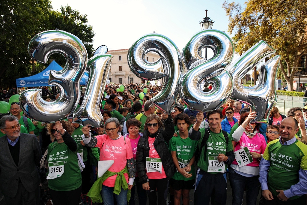 Palma se ha teñido de verde y miles de participantes han tomado las calles del centro, corriendo o caminando, para dar su apoyo a los enfermos de cáncer y sus familias y a la labor que realiza la Asociación Española Contra el Cáncer en Baleares, participando en la quinta edición de la carrera “Aecc Mallorca en Marcha”, con salida y llegada en la Avenida Antoni Maura.