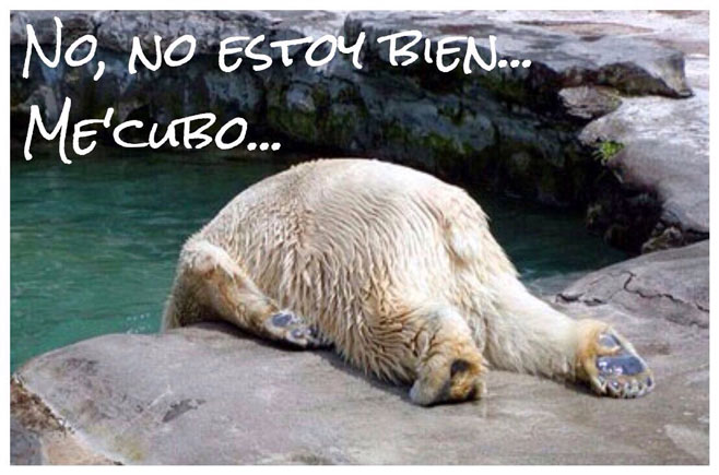 "¡No estoy bieeeen!¡Me'cuboooo! Fue lo último que dijo, lo enterraron al día siguiente" A este oso polar le pasa lo mismo que al padre de El Casta, está que no puede más. Porque este calor da más mareos que un parto.