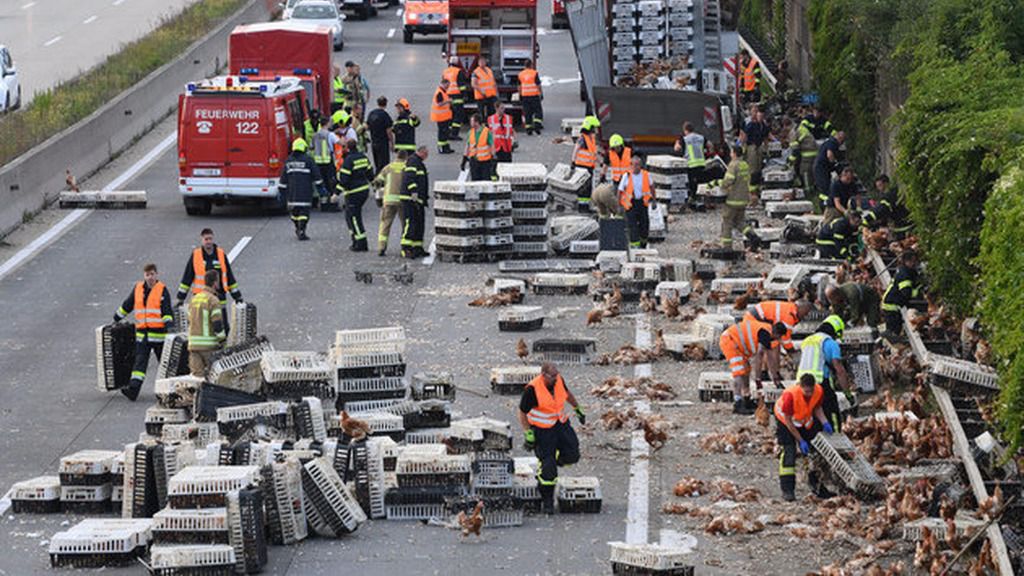 En la noche del martes miles de gallinas ocuparon una de las principalas autopistas de Austria. Según la policia austriaca, el conductor del camión que las transportaba se quedó dormido al volante y la parte trasera de este volcó, provocando que las jaulas de los animales se rompieran. Los demás conductores presenciaron como una marea de gallinas invadió la carretera. Aproximadamente 100 bomberos persiguieron a las gallinas para devolverlas a sus cajas.
