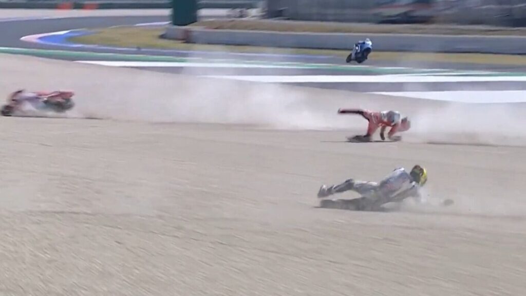 El español Fermín Aldeguer (Boscoscuro), que era decimoquinto, se fue por los suelos en esa misma vuelta, en la curva dos, quedando inédito en la segunda cita en tierras italianas, como también poco después el británico Sam Lowes (Kalex), que ocupaba la sexta posición.