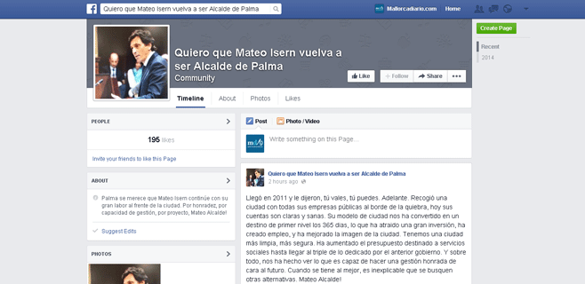 Creado por un usuario anónimo, el lema es: "Palma se merece que Mateo Isern continúe con su gran labor al frente de la ciudad. Por honradez, por capacidad de gestión, por proyecto, Mateo Alcalde!"