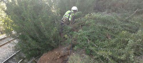 En relación a las obras de la trinchera de Sa Bomba, también se talarán algunos pinos que crecen amenazando la catenaria y ejerciendo una sobrecarga al talud, como paso previo a la colocación de una malla de triple torsión que permitirá contener pequeños desprendimientos de piedras.