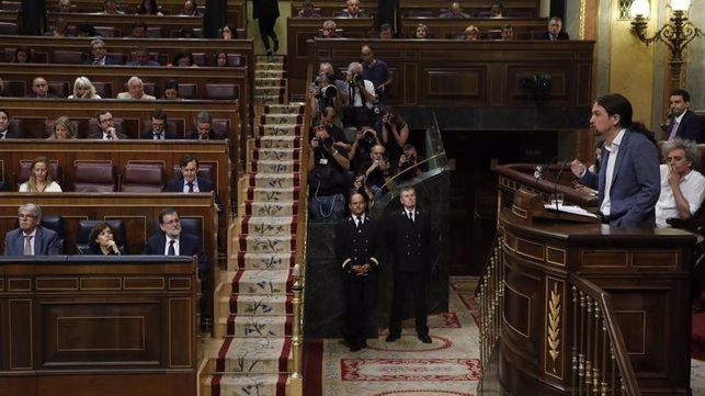 El secretario general de Podemos, Pablo Iglesias, durante su discurso como candidato del partido impulsor de la moción de censura al Gobierno de Mariano Rajoy (PP), se ha referido desde la tribuna de oradores a los habitantes de Balears como "Mallorquines, menorquines, ibicencos y formenterencos".