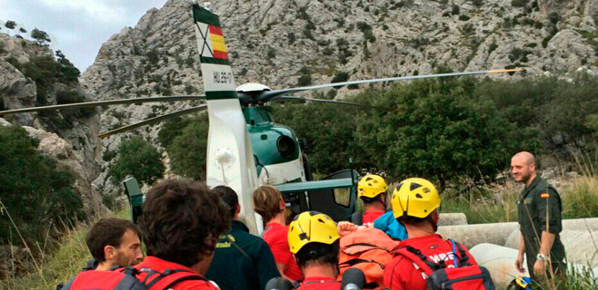 Sábado intenso de rescates por parte de la Guardia Civil. El helicóptero de la Benemérita ha evacuado a una mujer de unos 40 años de edad tras sufrir una caída mientras practicaba rapel en las Coves des Pilar, en la zona de Na Burguesa de Palma.