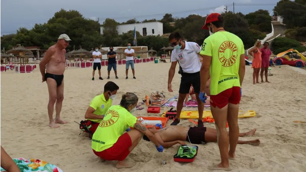 El servicio de socorrismo de la playa de Cala Marçal ha hecho un simulacro donde han intervenido tres socorristas. Uno de ellos ha detectado un bañista que no se movía y ha entrado en el mar para sacarlo. Posteriormente, ya en la arena, se han iniciado maniobras de reanimación con compresiones y ventilaciones.