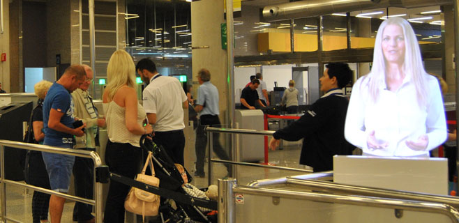 El Aeropuerto de Palma de Mallorca cuenta, desde este miércoles, con un asistente virtual en cada uno de sus filtros de seguridad (Norte y Sur) para informar a los pasajeros sobre los pasos que debe seguir antes de acceder al control de seguridad.