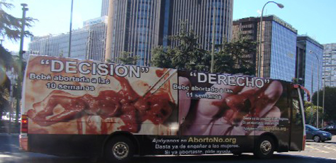 Un autobús con fotos de un supuesto feto ensangrentado fuera del útero recorre desde hace unos días y lo seguirá haciendo durante las próximas dos semanas las calles de Madrid en una iniciativa de protesta contra el aborto realizada por el Centro para la Reforma Bioética de España, organización ultraconservadora estadounidense que, con esta acción, se da a conocer en España. Con 'AbortoNo' como nombre asignado al proyecto, se quiere "informar sobre la auténtica realidad del aborto provocado", según se indica en su página web. La organización destaca que en los últimos años se han producido "más de 100.000 abortos" anuales "dejando decenas de miles de mujeres gravemente dañadas por las secuelas psicolopatológicas del aborto". Así, el "objetivo final de 'AbortoNo' es dar a conocer públicamente a la sociedad civil la realidad impensable del aborto para lograr que la ley proporcione plena protección a los bebés nonatos/as y a sus mamás", señala. El aborto no es sólo un asunto 'religioso'; es un asunto de derechos humanos "El aborto no es sólo un asunto 'religioso'; es un asunto de derechos humanos que afecta a todos", sentencian.