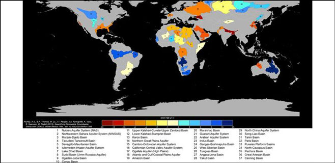 Alrededor de un tercio de las mayores cuencas de aguas subterráneas de la Tierra se están agotando rápidamente por el consumo humano. Dos nuevos estudios dirigidos por la Universidad de California, Irvine (UCI), utilizando datos de los satélites climáticos GRACE de la NASA, advierten de que una parte significativa de la Humanidad está consumiendo agua subterránea rápidamente sin saber cuándo podría agotarse. Los resultados se publican en Water Resources Research. Aquí se muestra la imagen amplíada.