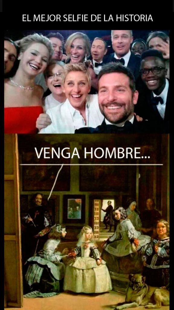 Ha sido la imagen más retuiteada de la Historia... Y uno de los Maestros de la pintura, Diego de Velázquez, "se ríe" de semejante hazaña. El selfie de las estrellas de la gala de los Oscar -con Ellen Degeneres, Julia Roberts, Brad Pitt, Angelina Jolie y Meryl Streep entre otros-, compite con el otro "selfie" por antonomasia: el que realizó el pintor barroco en el siglo XVII, cuando se autorretrató en Las Meninas. Las redes sociales están moviendo masivamente el montaje, haciendo un guiño a la ocurrencia del español, bastantes siglos antes que el del star system.