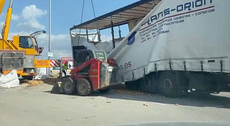 Un camión cargado de patatas ha volcado en las cercanías de la rotonda de IKEA en Palma desparramando gran parte de su carga lo que ha provocado retenciones circulatorias.